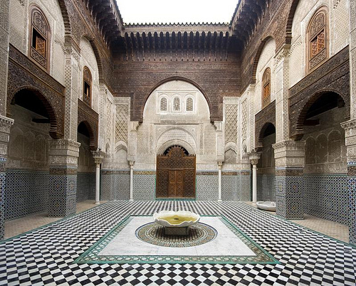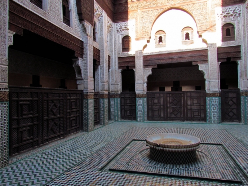 A medersa is a school where the Koran is taught along with all the classic subject of learning: mathematics, grammar, history, astronomy, medicine… In Morocco, and especially in Fès, medersas have the important role of integrating students from other regions. Generally they are built around a central courtyard with a fountain. Classes are held under the sumptuous arcades bordering it.